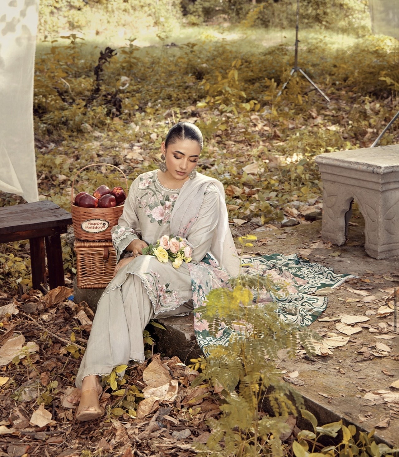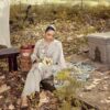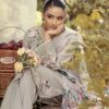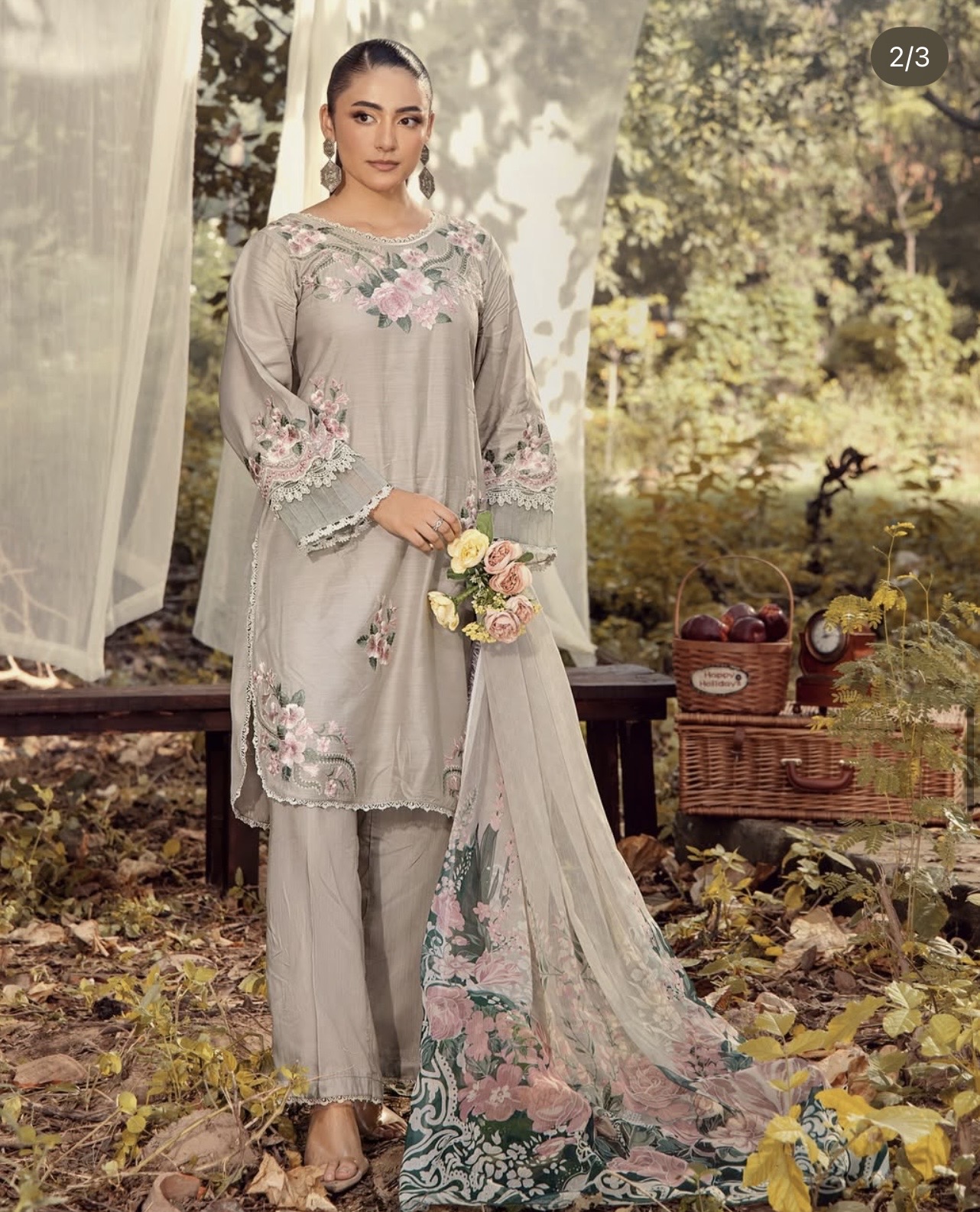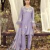 This gorgeous outfit comes on viscous material with embroidery work on the kameez. The outfit consists of round daman wide trousers and a printed chiffon duppata.