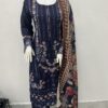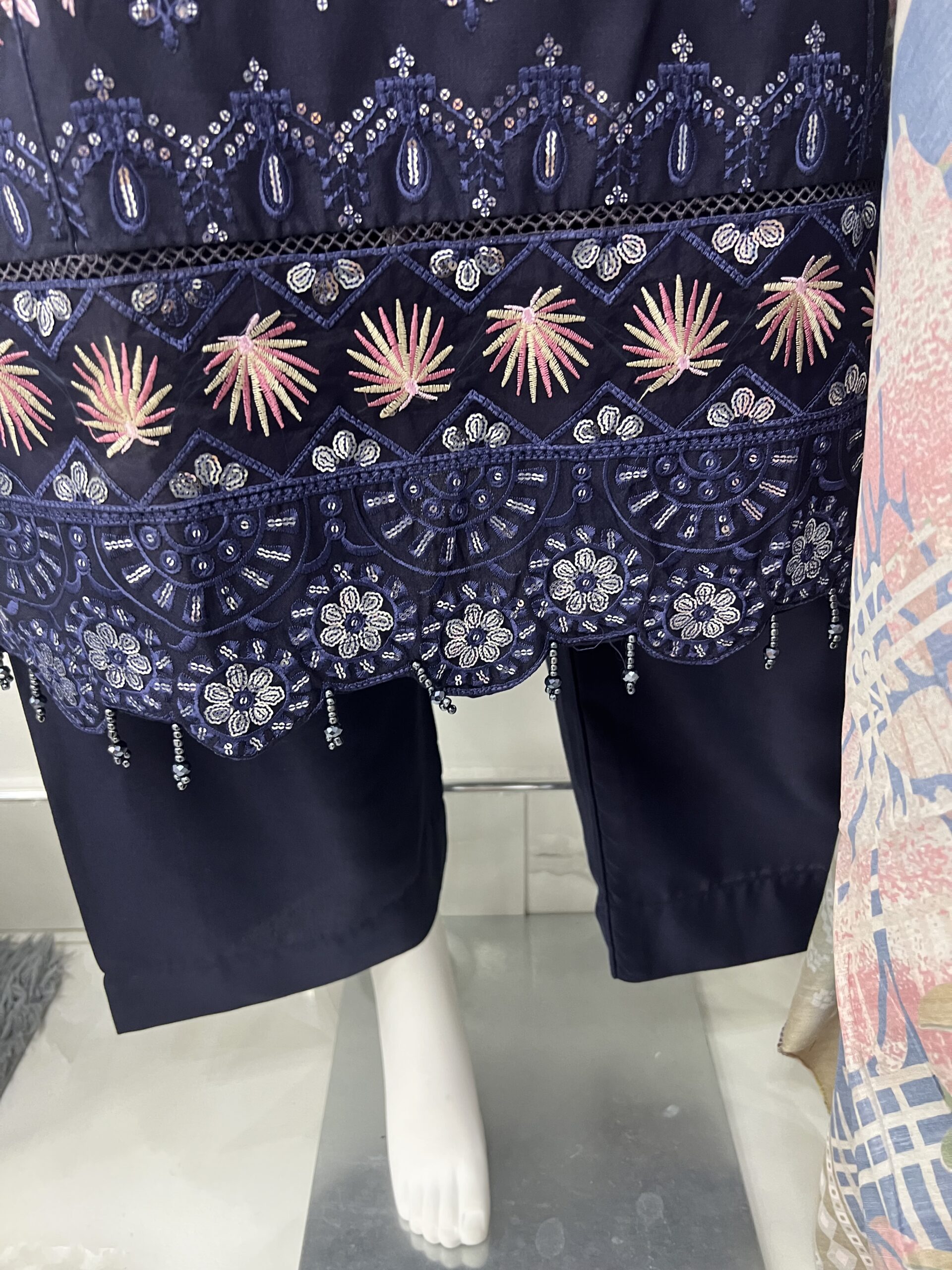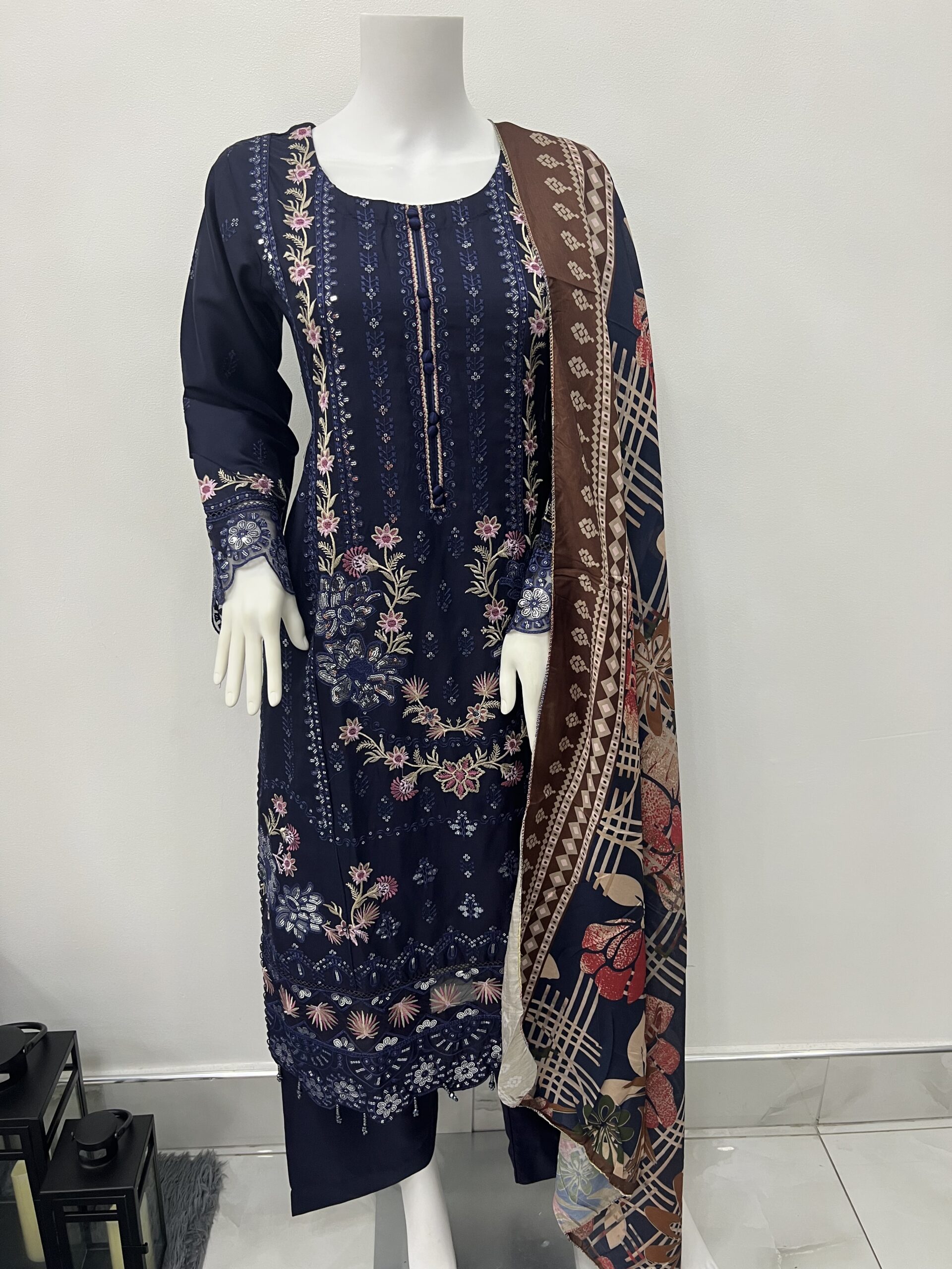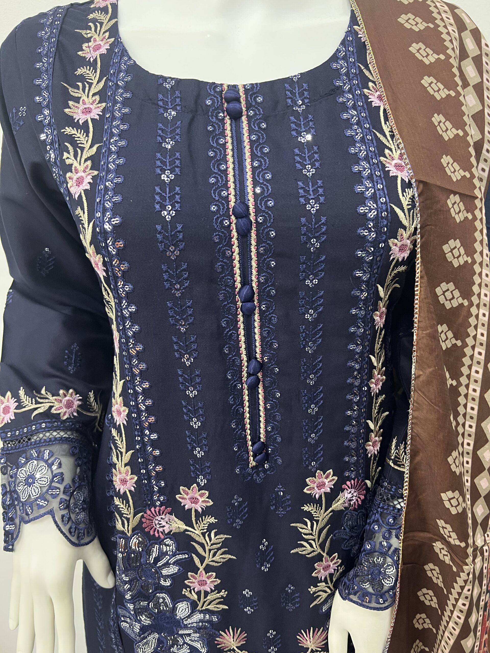 This gorgeous outfit comes in dahank material with embroidery and sequin work on the kameez. The outfit is completed withh dhanak plazzo trousers and a printed duppata.