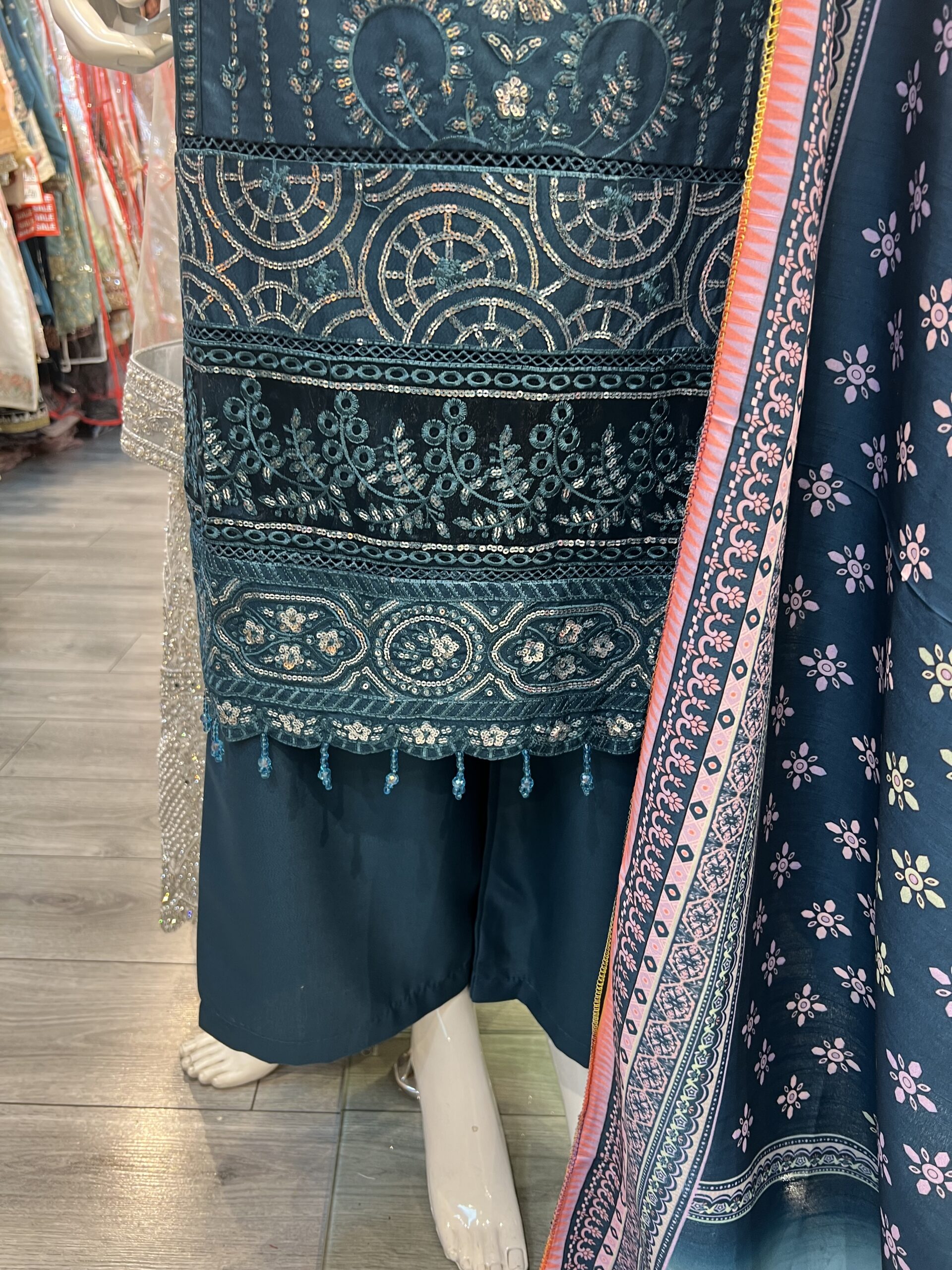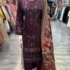 This gorgeous outfit comes in dahank material with embroidery and sequin work on the kameez. The outfit is completed withh dhanak plazzo trousers and a printed duppata.