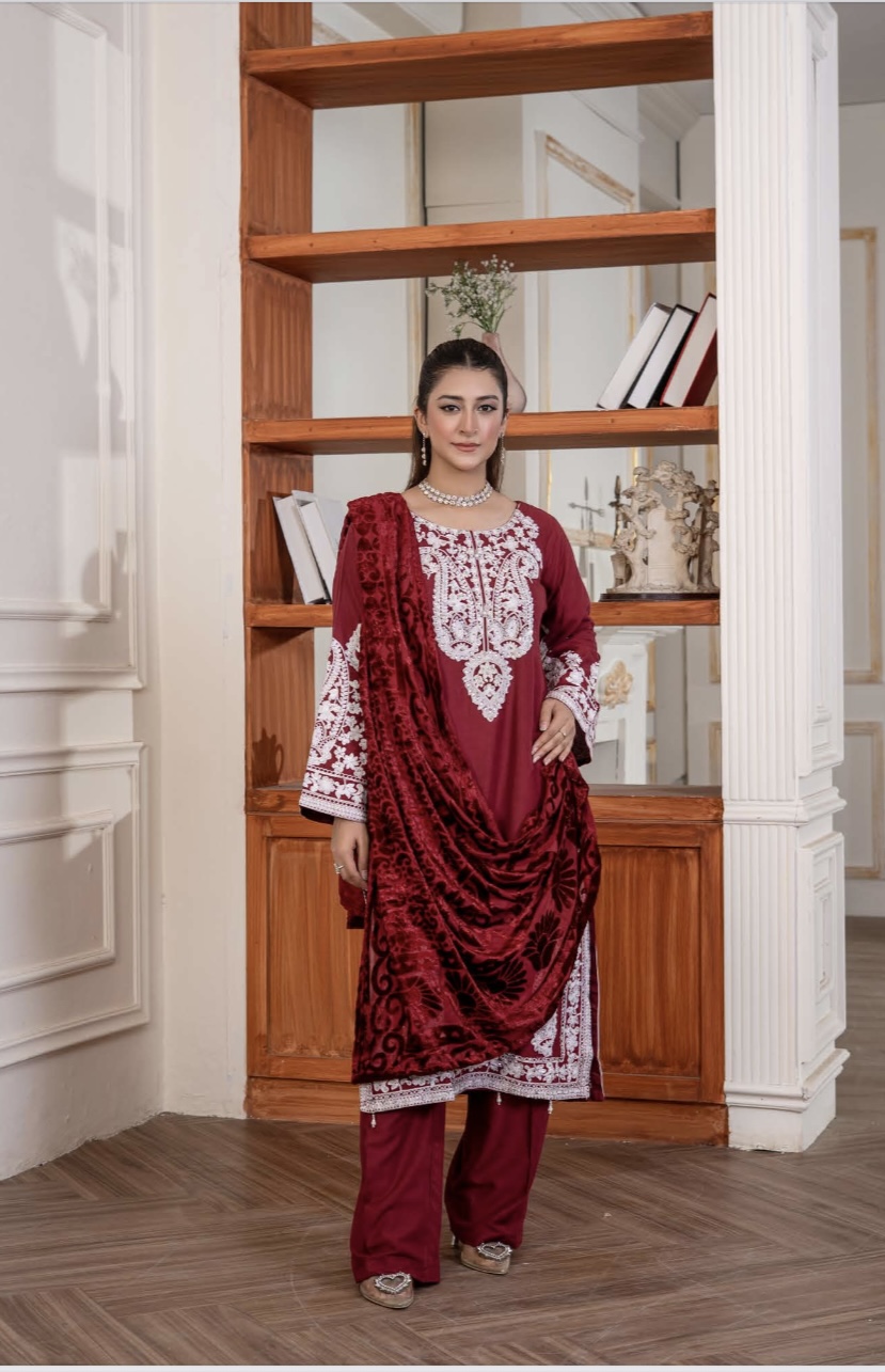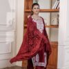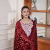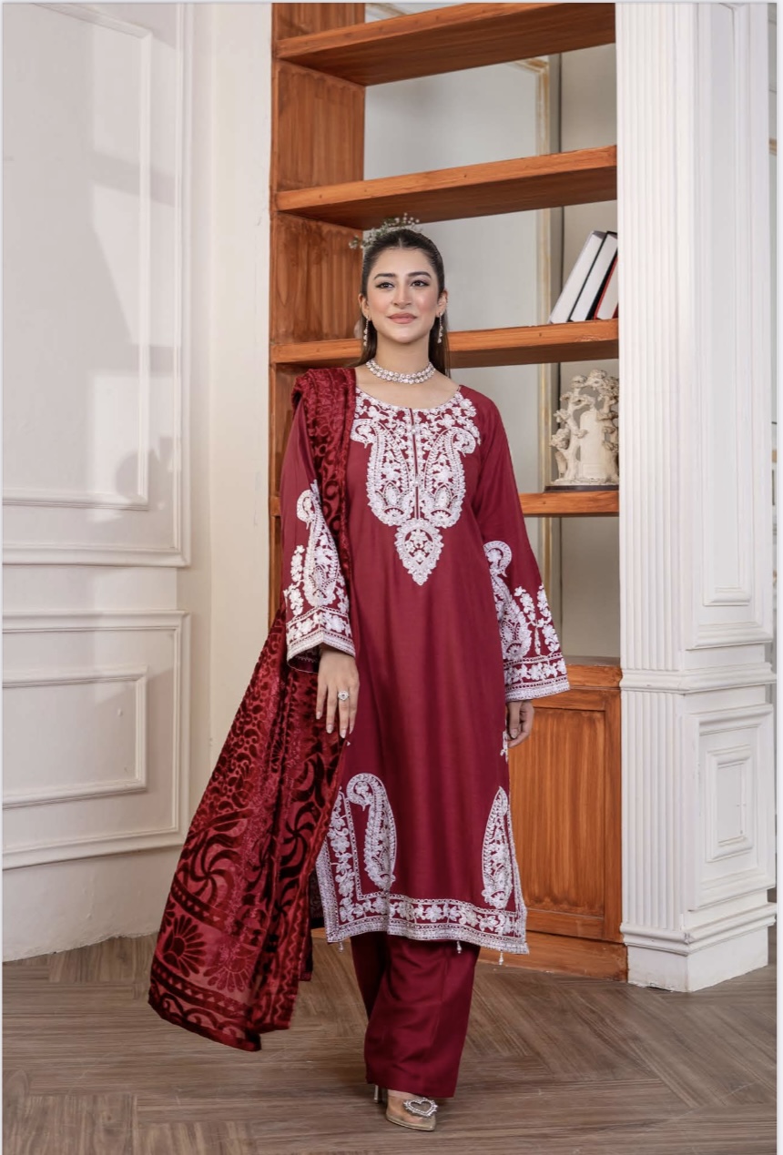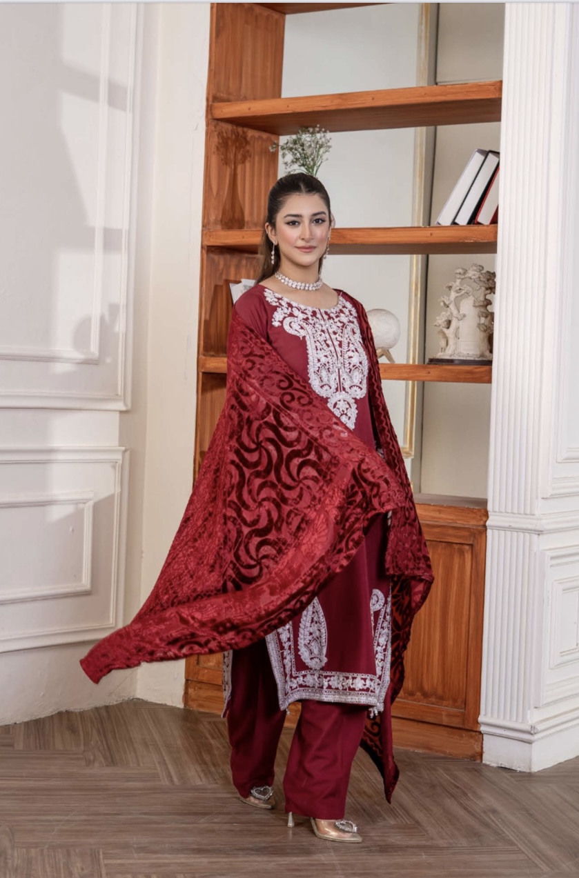 This gorgeous outfit comes in dahank material with embroidery and sequin work on the kameez. The outfit is completed withh dhanak plazzo trousers and a palachi duppata.