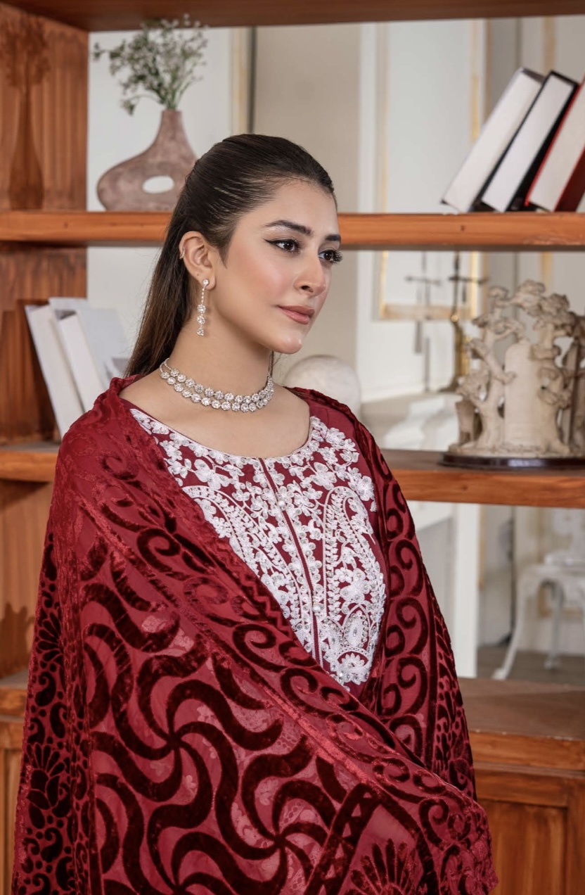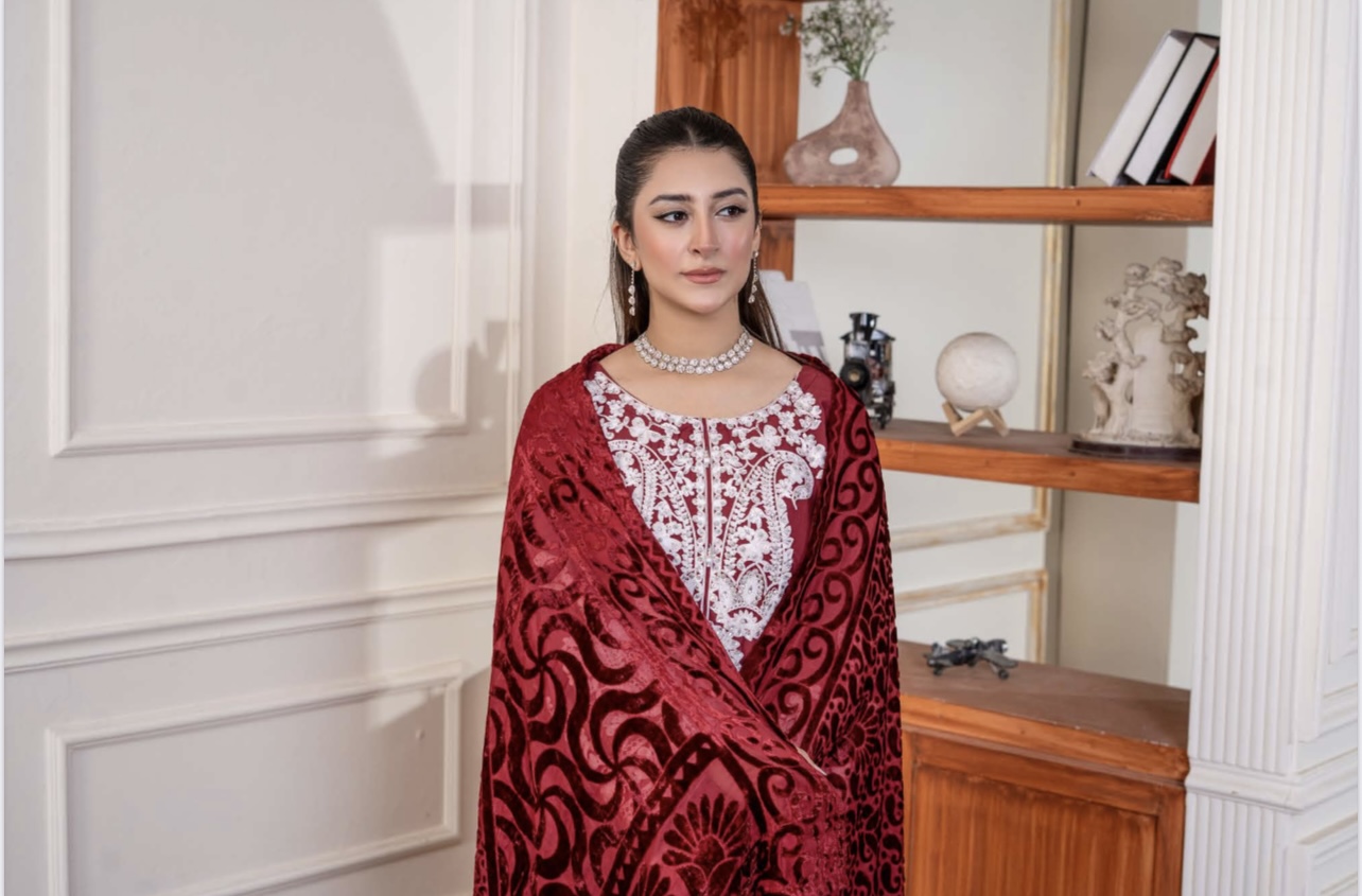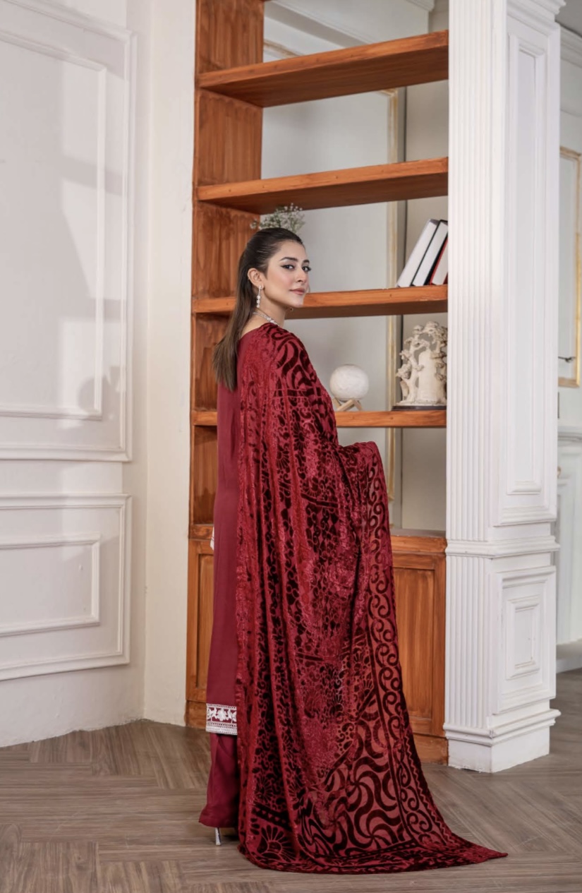 This gorgeous outfit comes in dahank material with embroidery and sequin work on the kameez. The outfit is completed withh dhanak plazzo trousers and a palachi duppata.