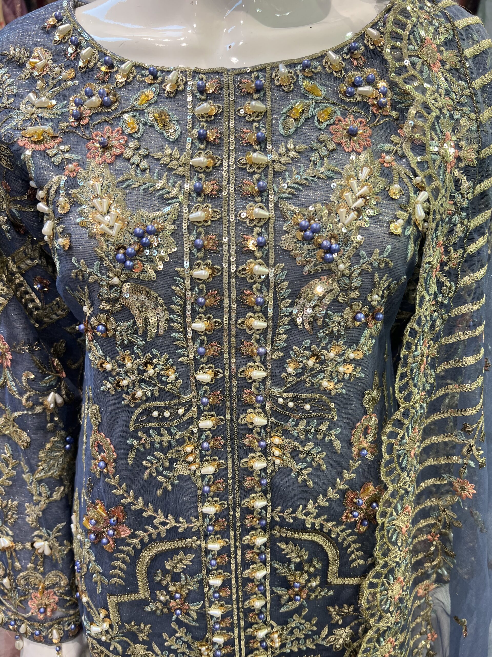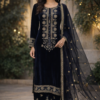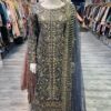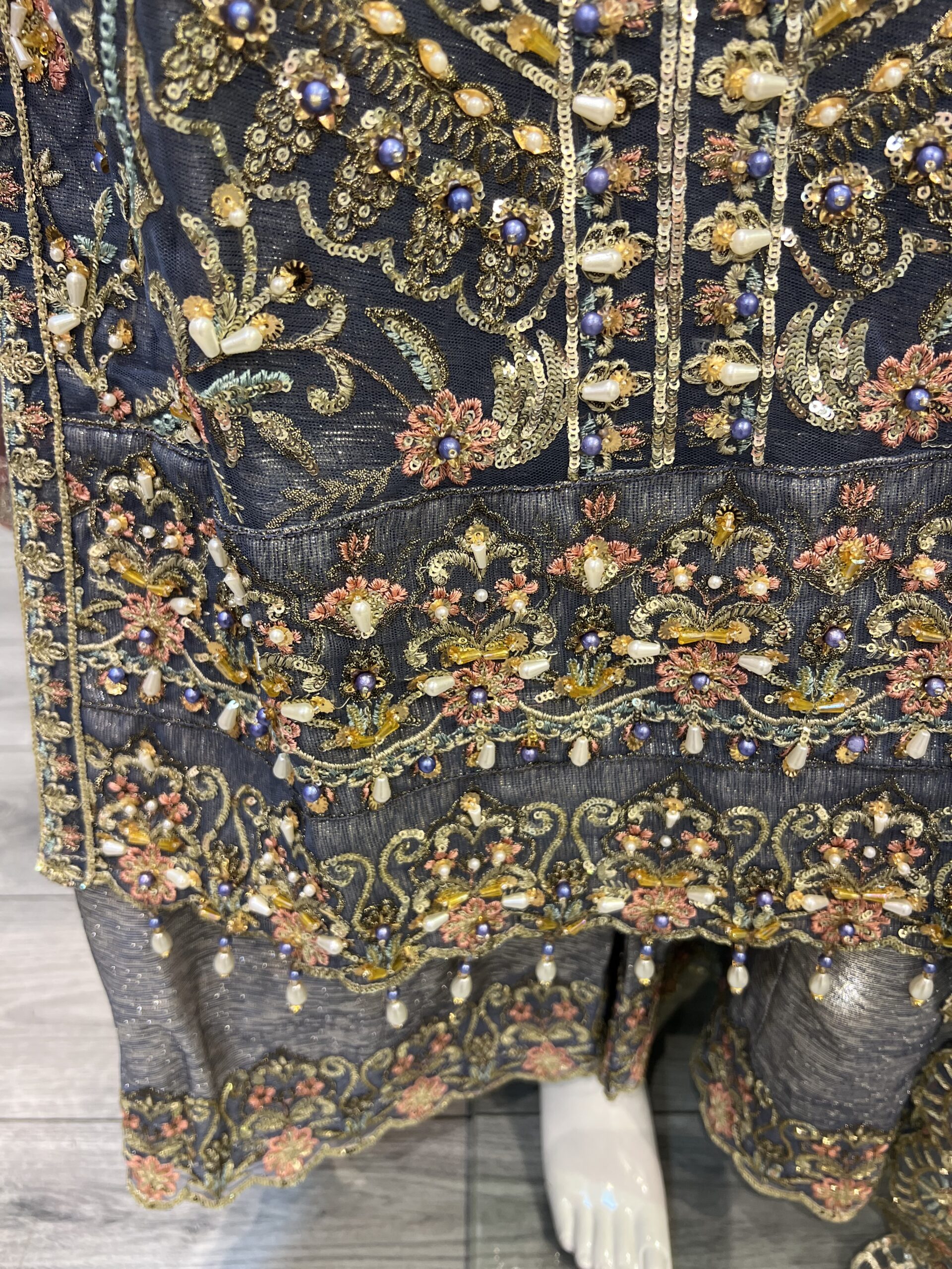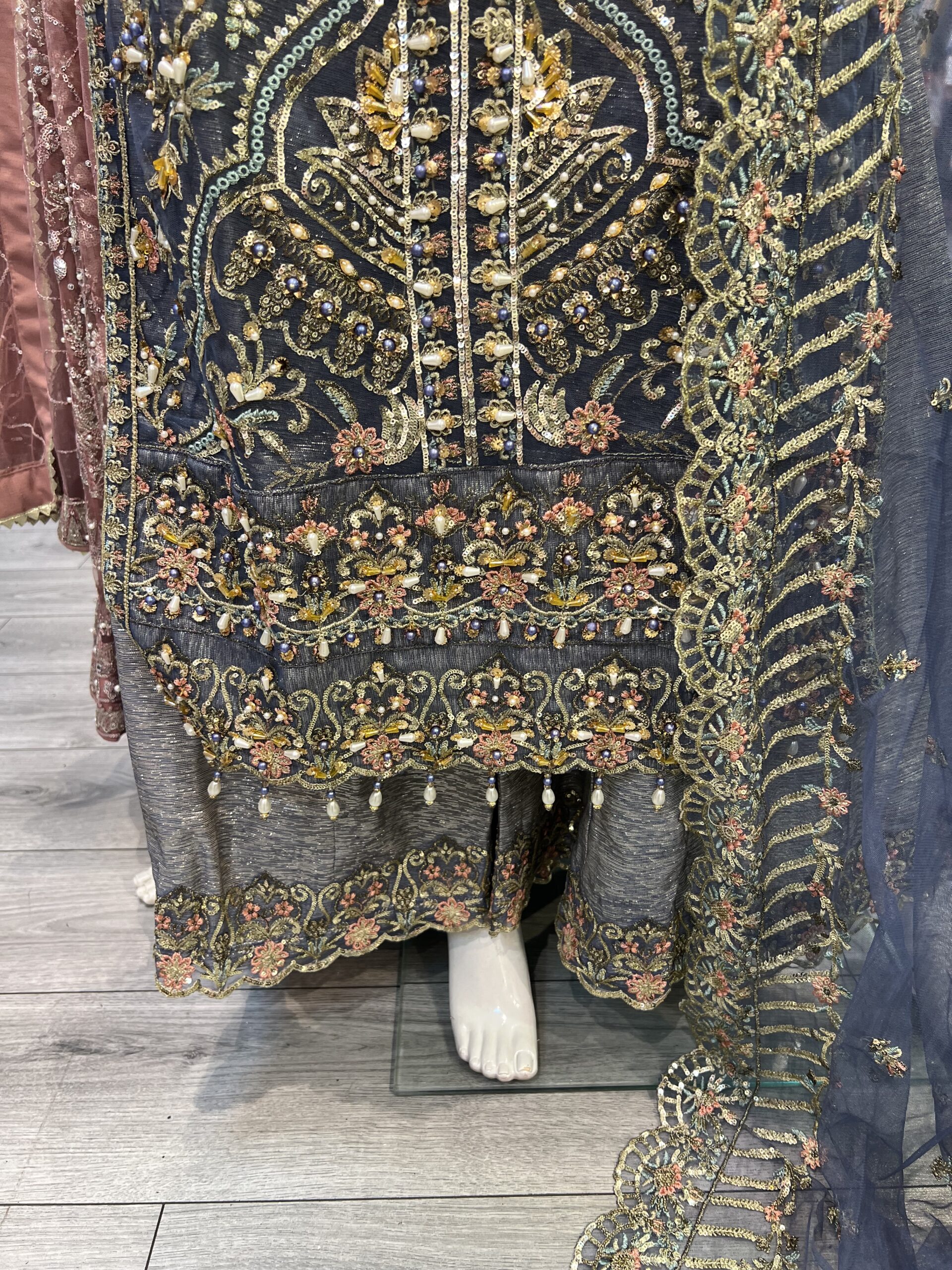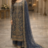 This gorgeous comes with a heavy embroidered long length shirt with embroidery and embellishments running through the kameez. The outfit is completed with a wide leg embroidered plazzo and an embroidered chifffon duppata.💫🖤