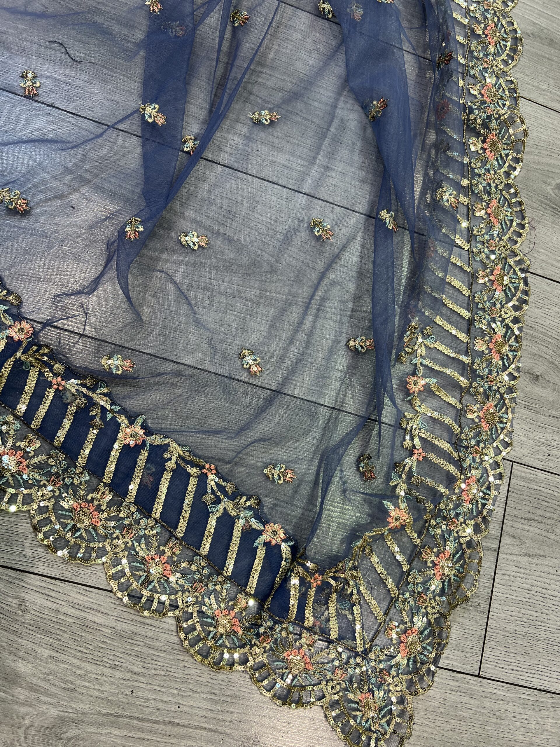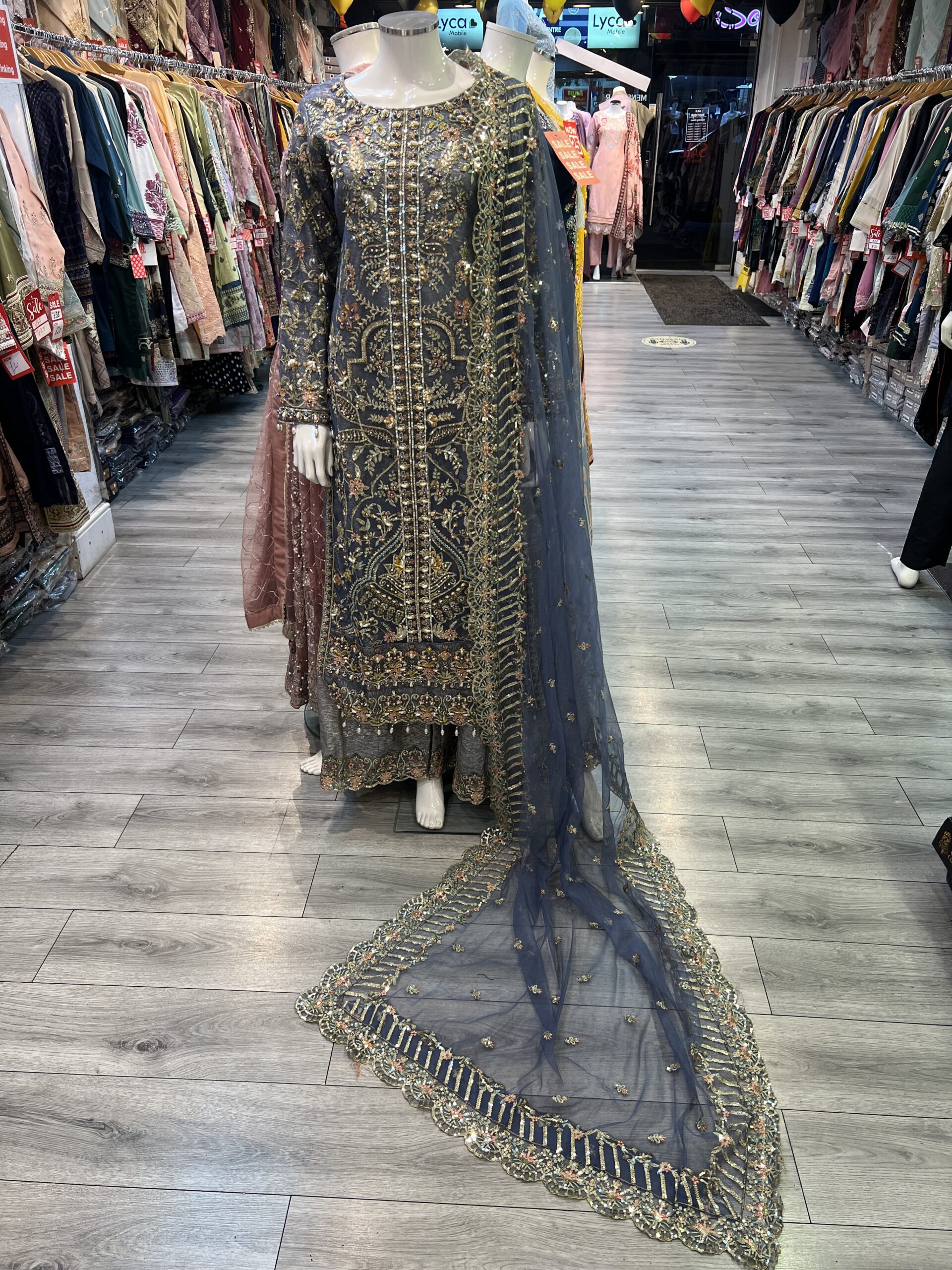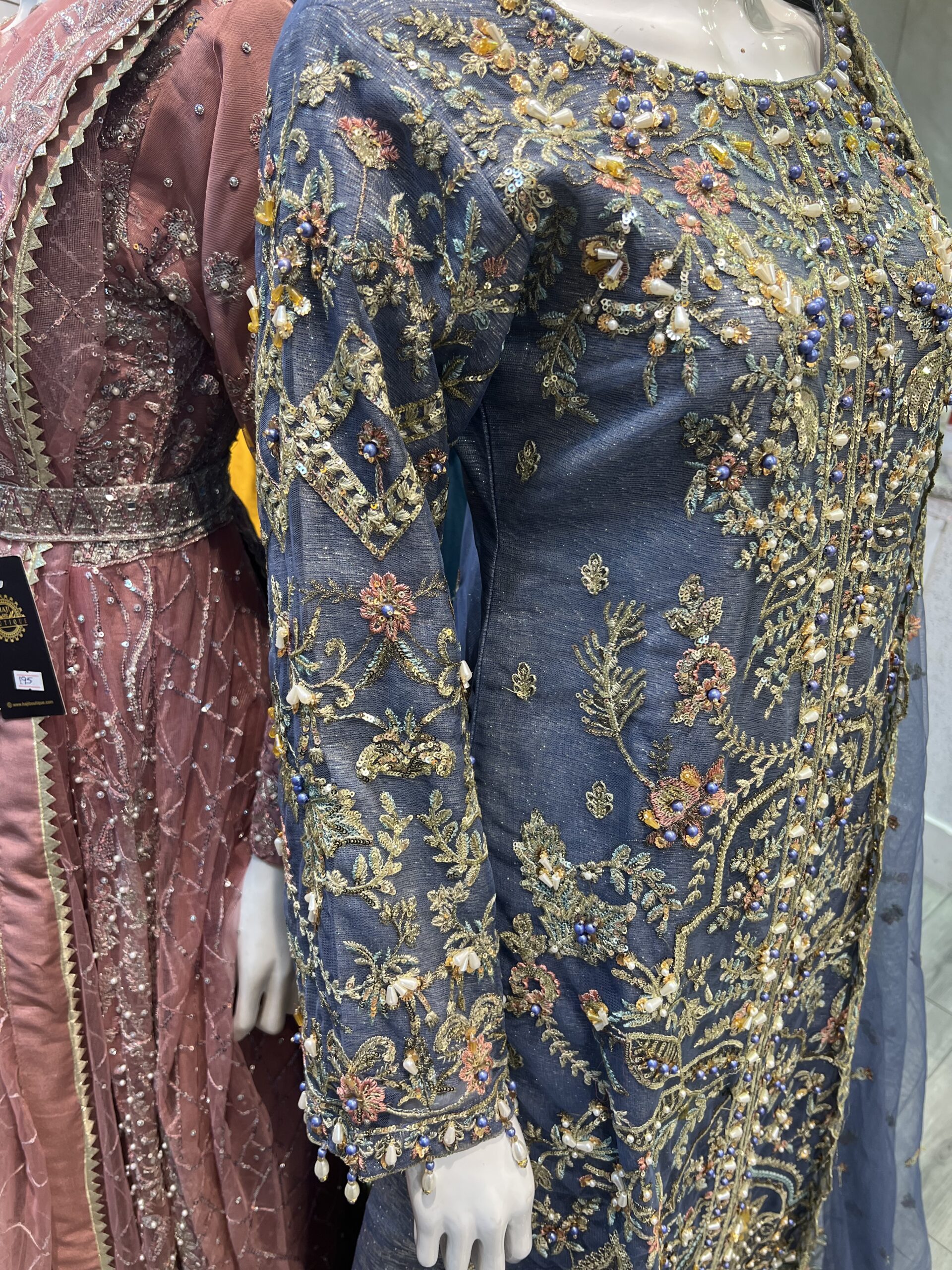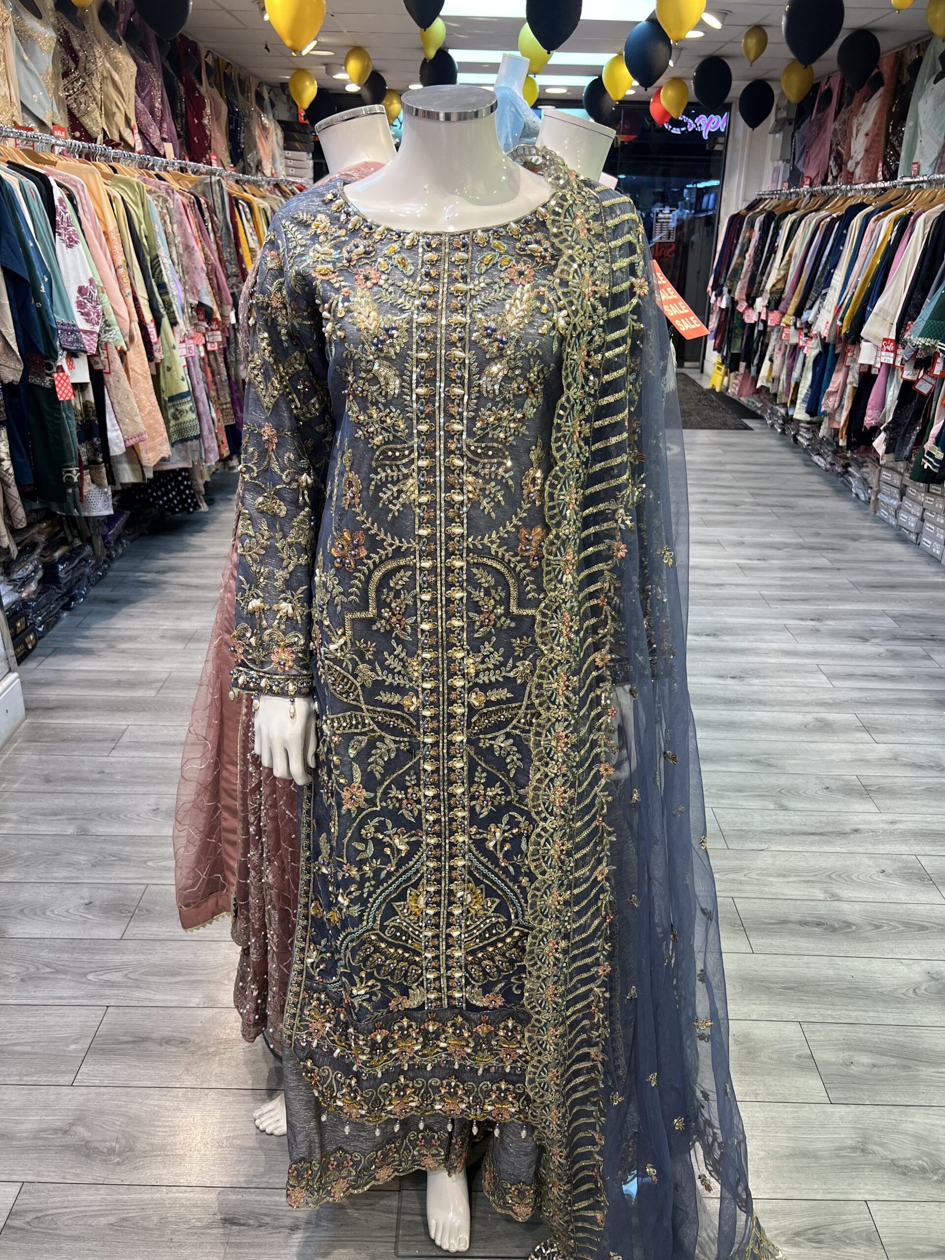 This gorgeous comes with a heavy embroidered long length shirt with embroidery and embellishments running through the kameez. The outfit is completed with a wide leg embroidered plazzo and an embroidered chifffon duppata.💫🖤