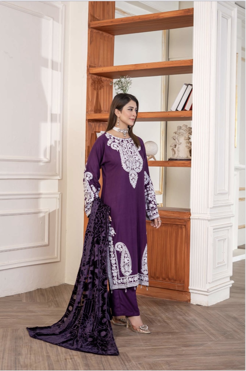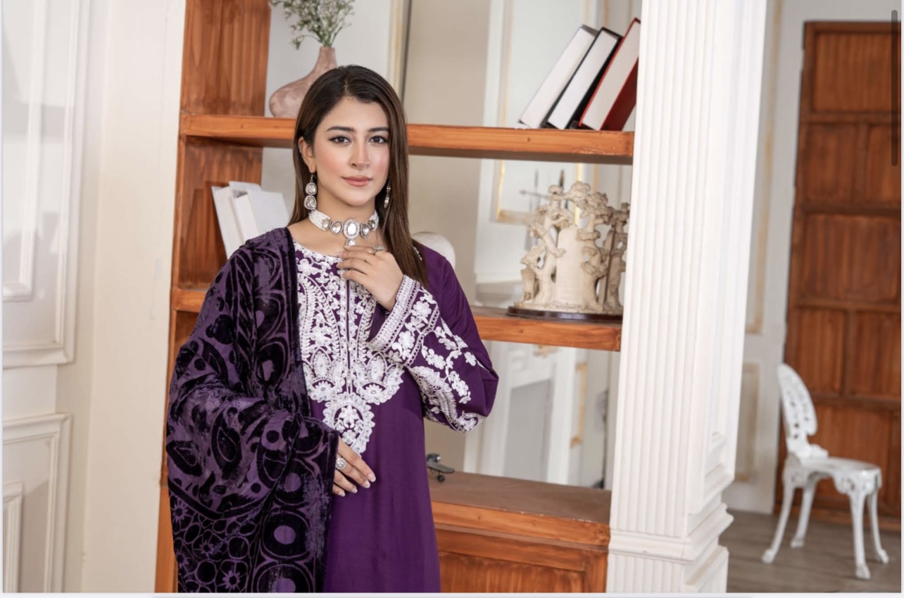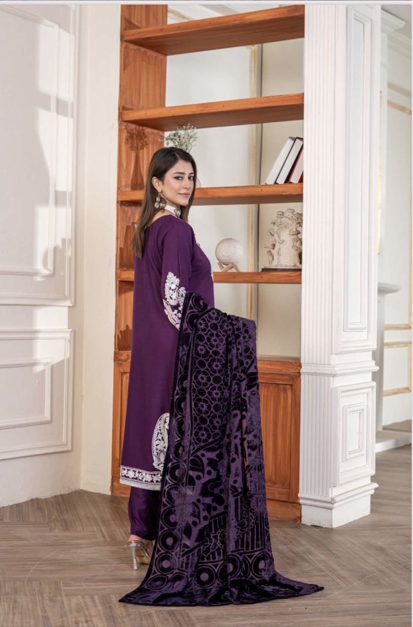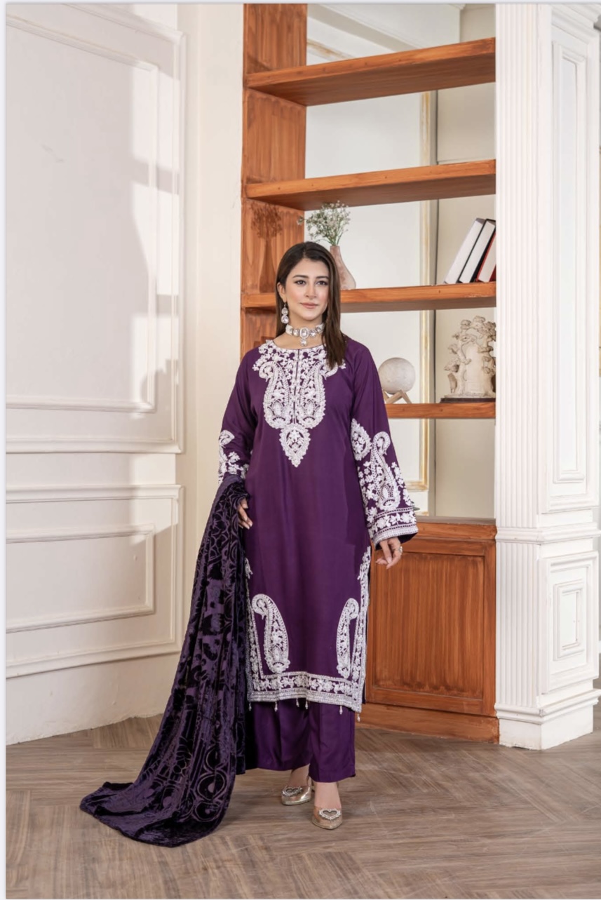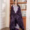Fiza Dhanak suit with palachi shawl plum