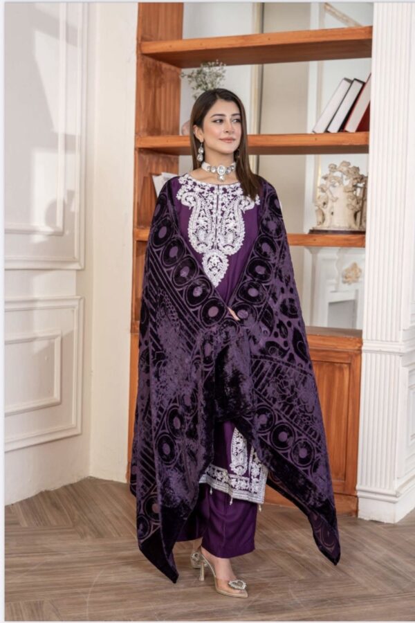 This gorgeous outfit comes in dahank material with embroidery and sequin work on the kameez. The outfit is completed withh dhanak plazzo trousers and a palachi duppata.