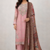 This gorgeous outfit comes in dahank material with embroidery and sequin work on the kameez. The outfit is completed withh dhanak plazzo trousers and a printed duppata.
