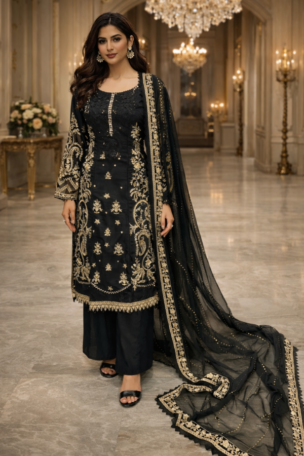 A-line chiffon dress with intricate embroidery, paired with silk palazzo trousers & an embroidered chiffon dupatta — made to turn heads 💫🖤