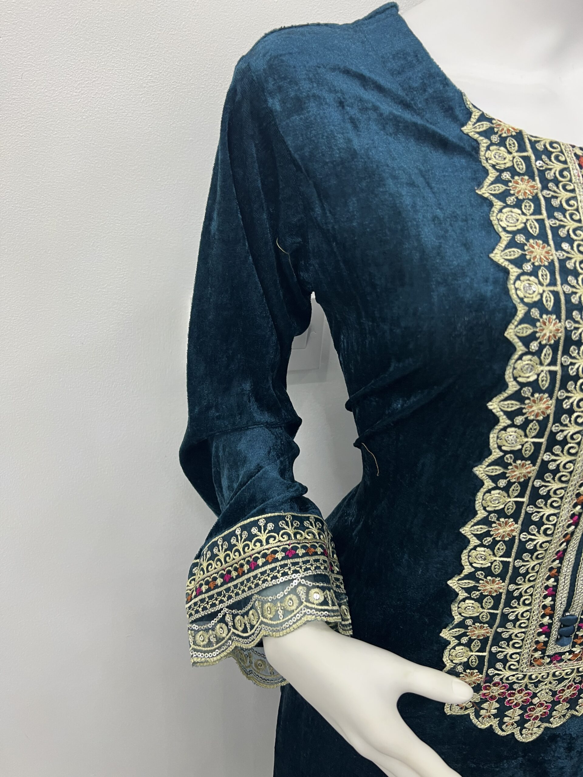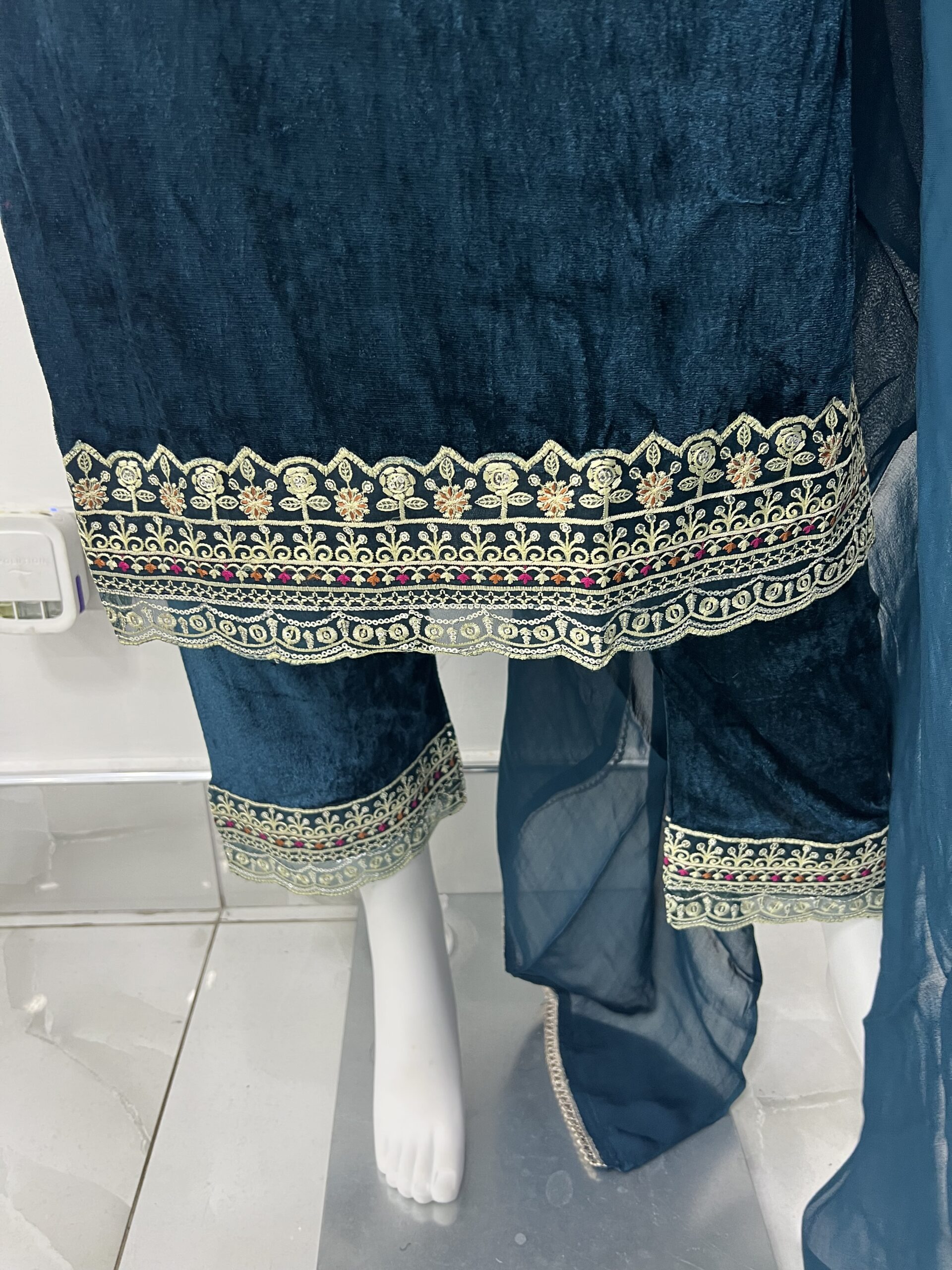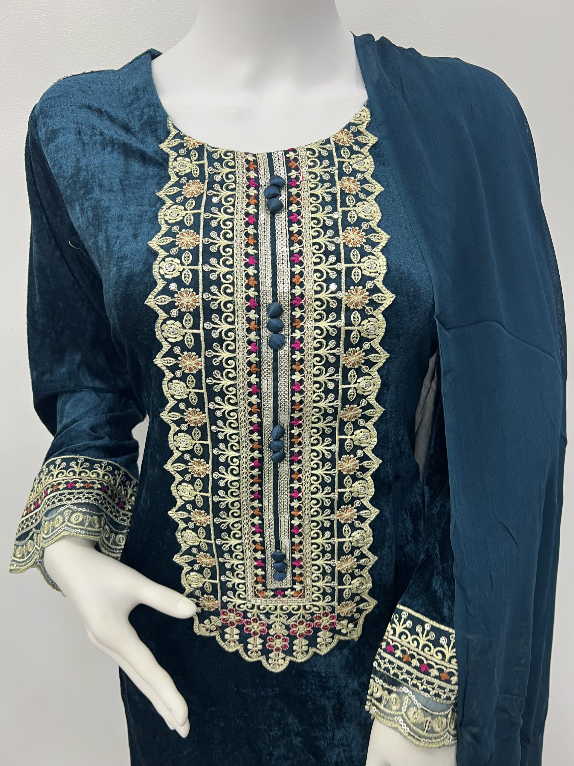 Upgrade your wardrobe with our gorgeous velvet embroidery suit. Made from high-quality velvet material, this suit is the perfect choice for those who are looking for both comfort and style. The intricate embroidery work on the kameez adds a touch of elegance and makes it an ideal selection for special occasions.