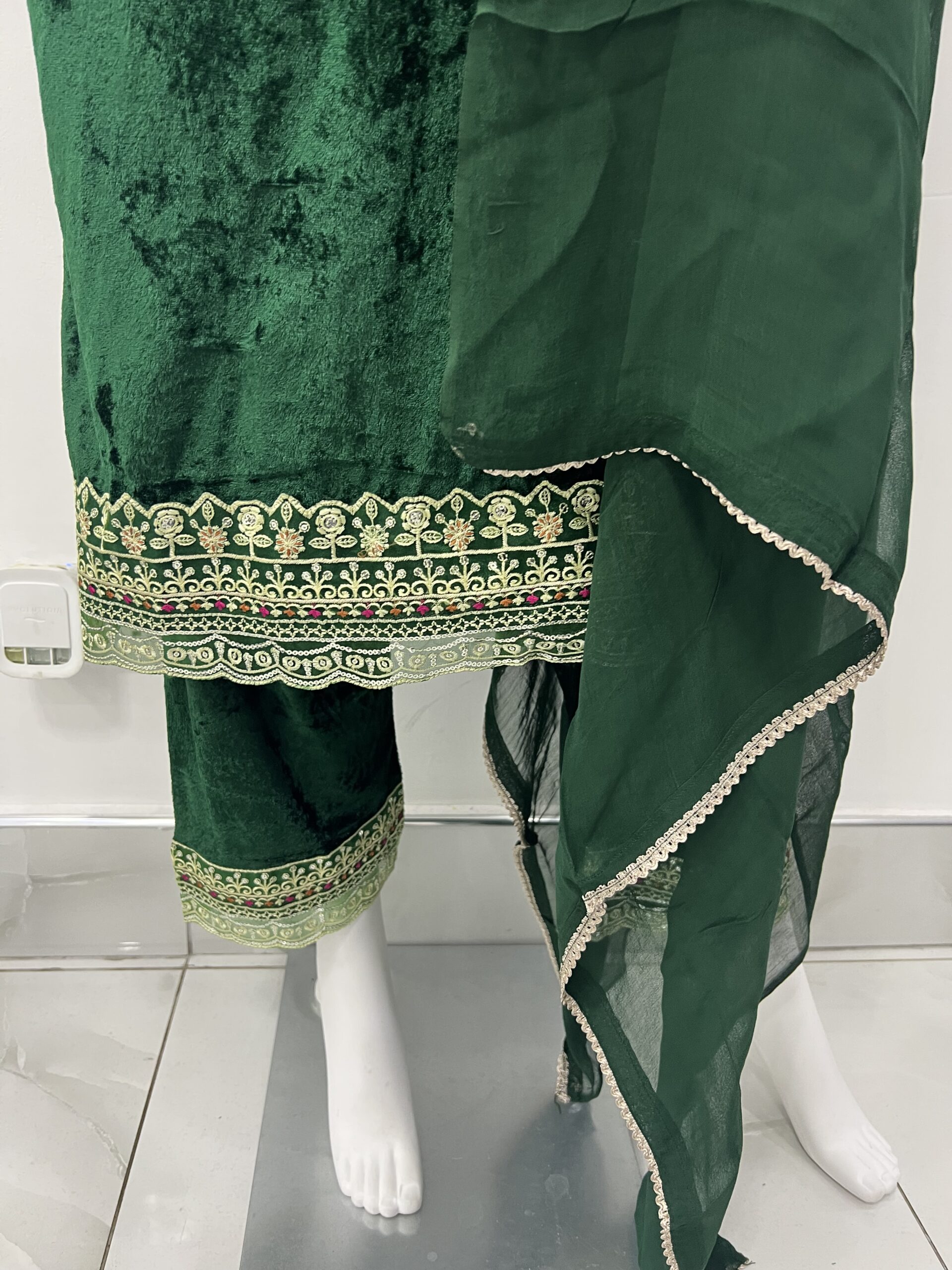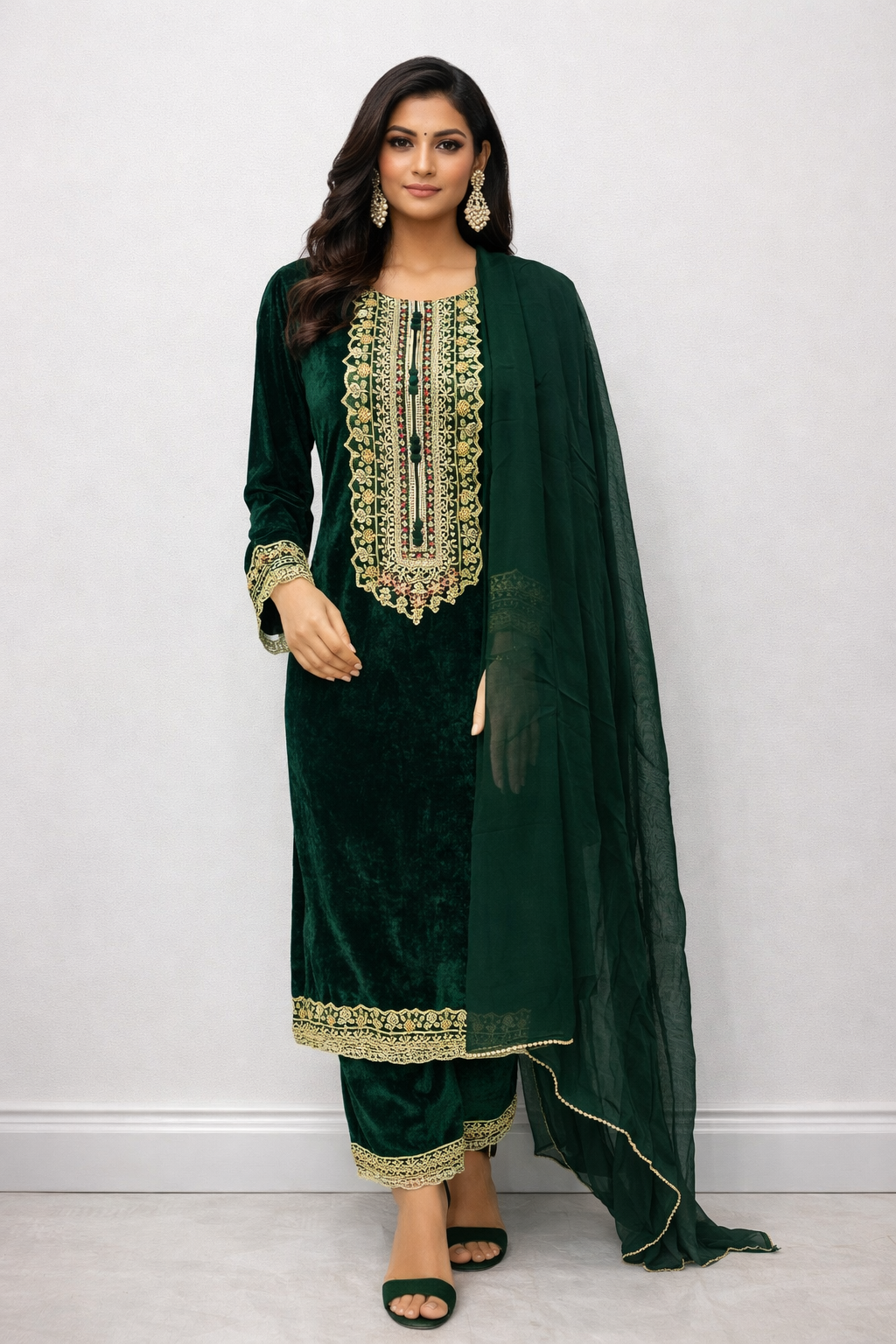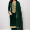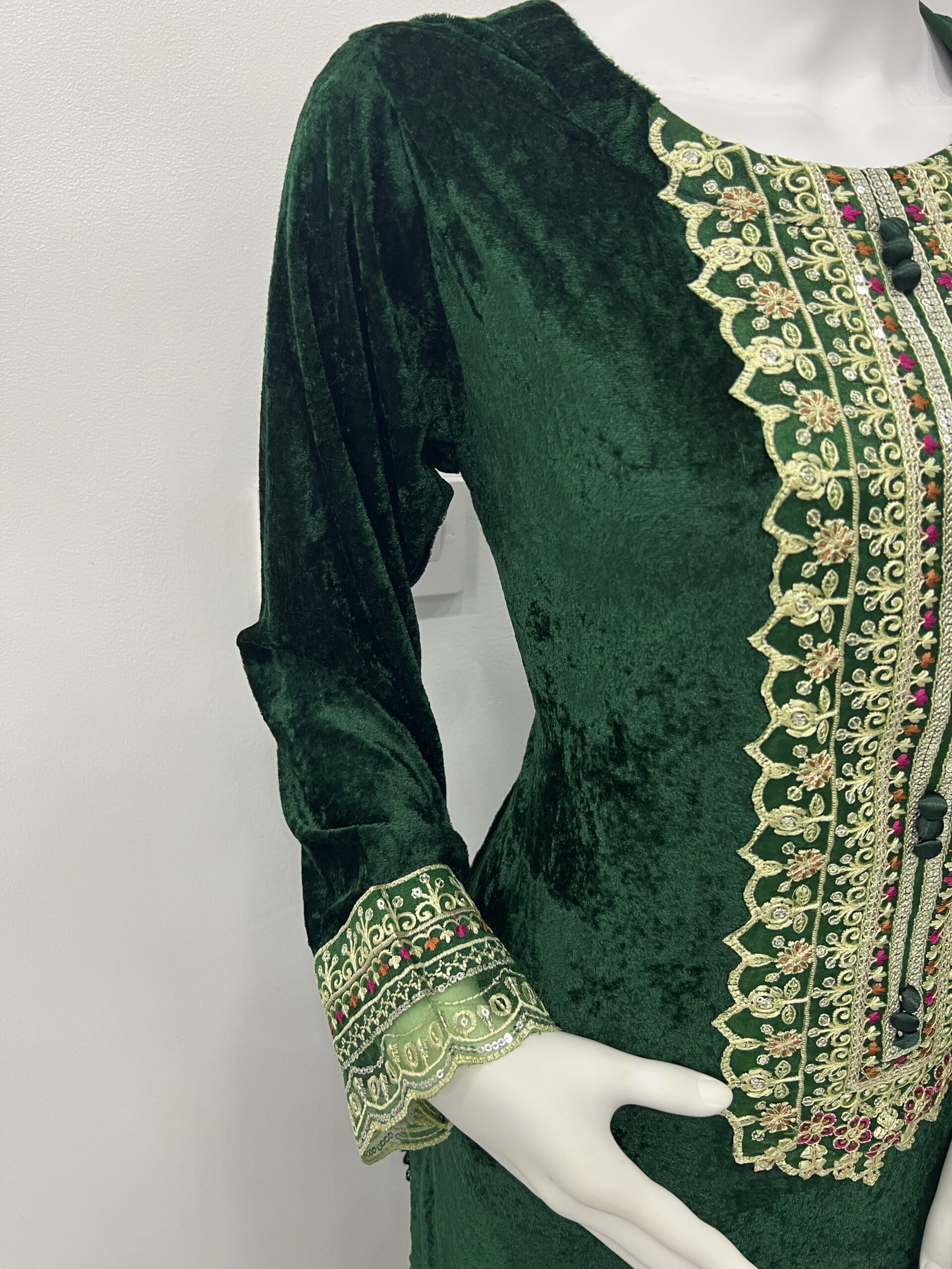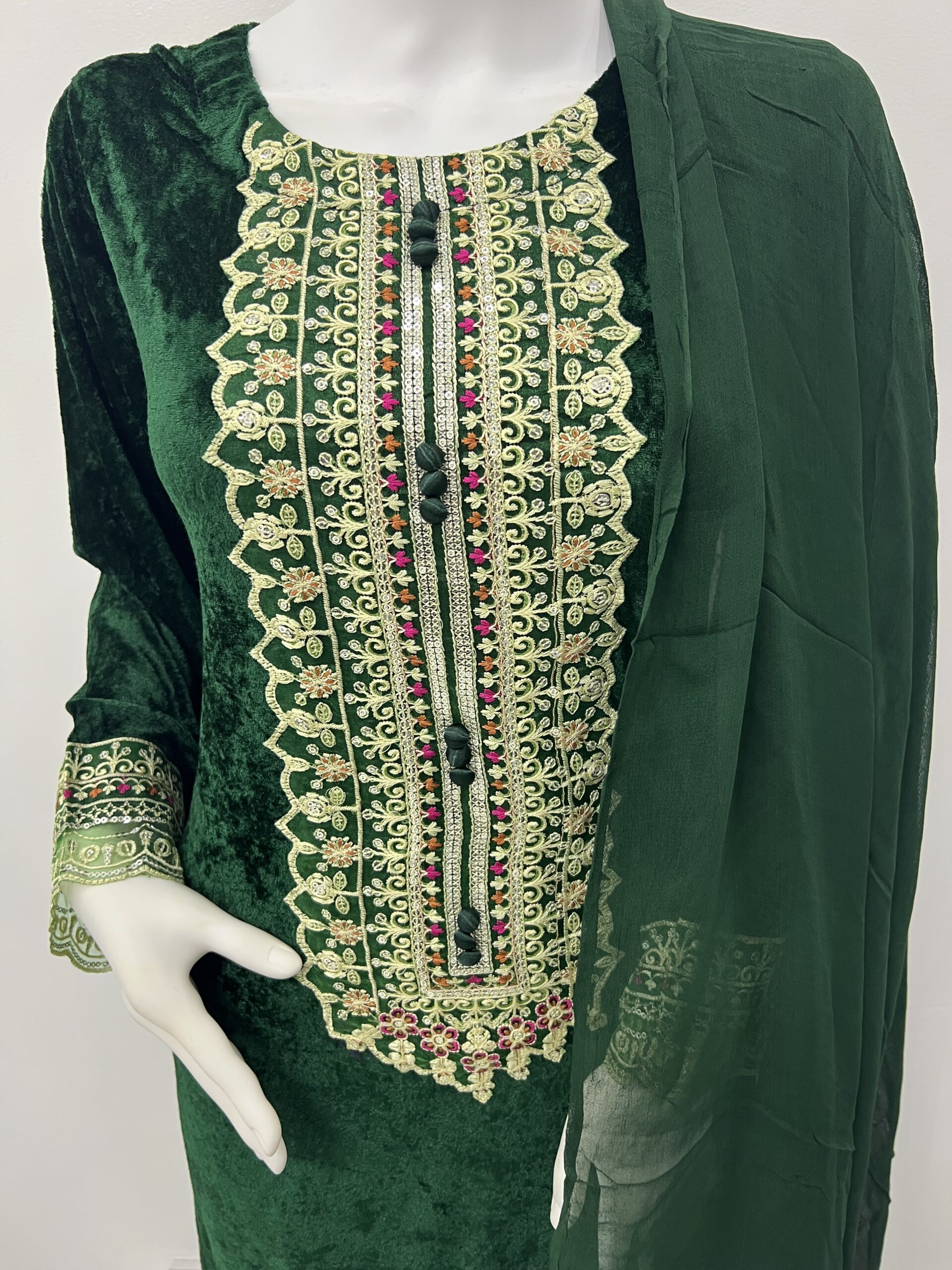 Upgrade your wardrobe with our gorgeous velvet embroidery suit. Made from high-quality velvet material, this suit is the perfect choice for those who are looking for both comfort and style. The intricate embroidery work on the kameez adds a touch of elegance and makes it an ideal selection for special occasions.