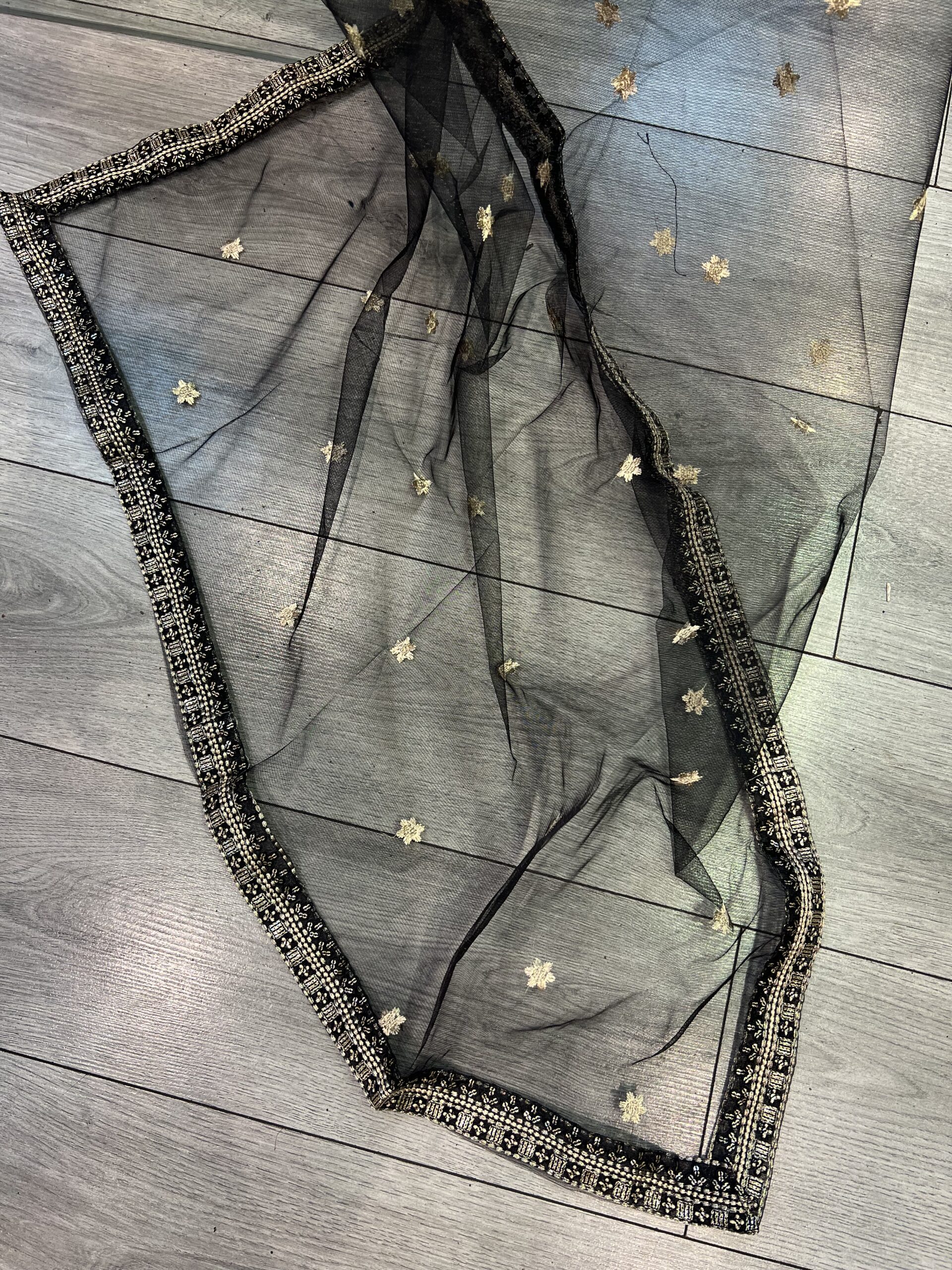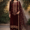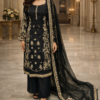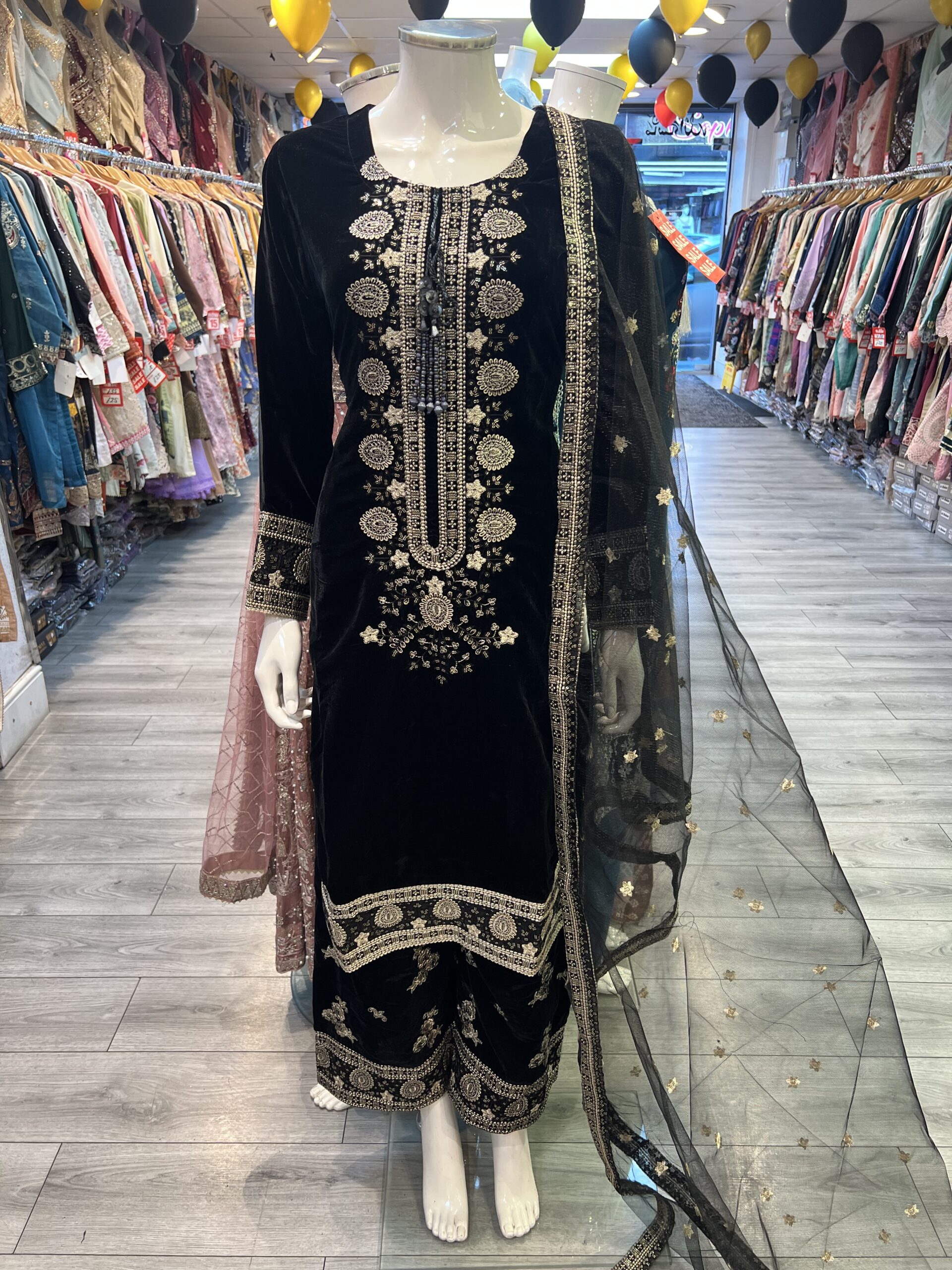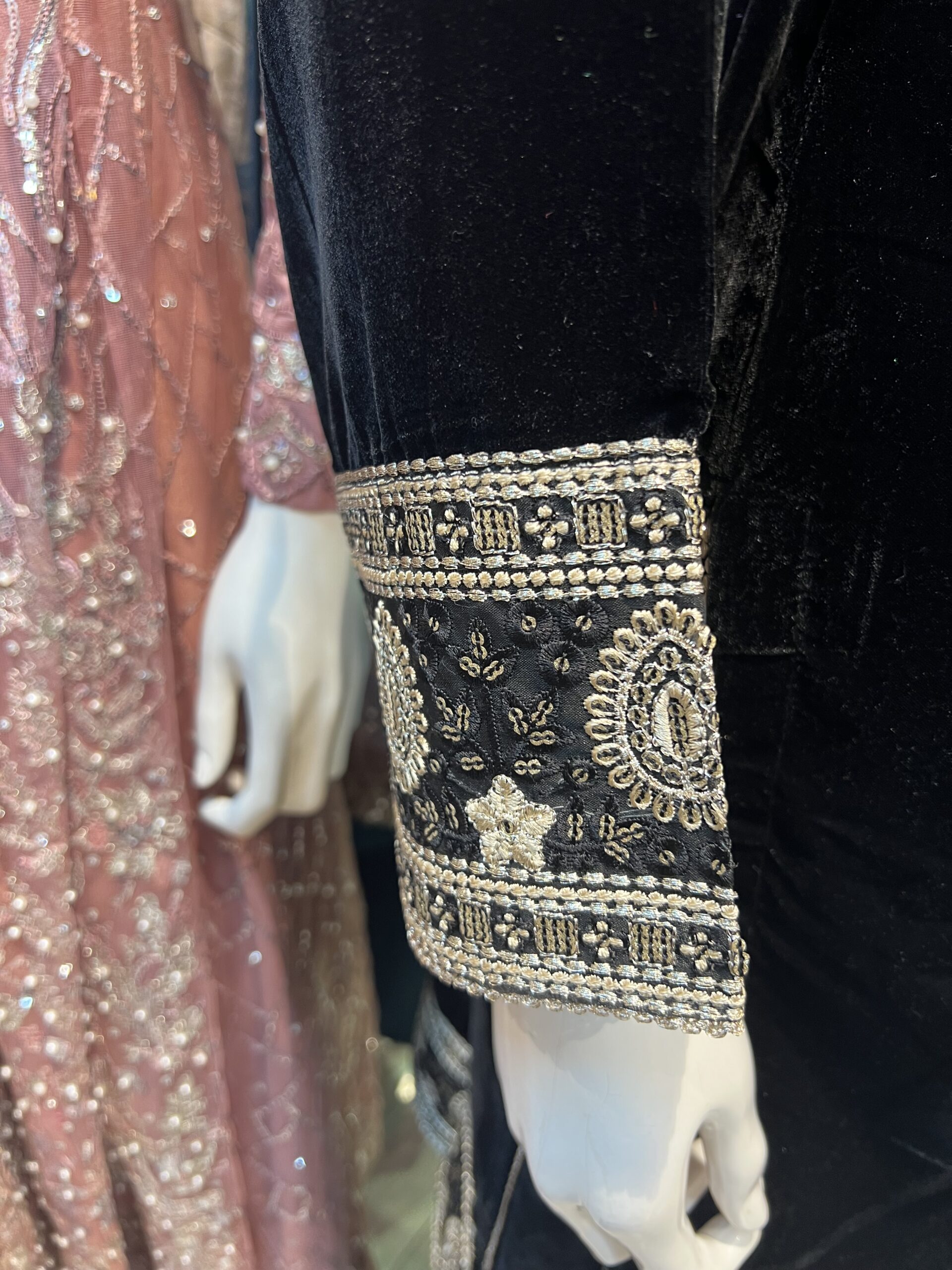 This gorgeous suit comes in micro velvet material with embroidery and tassel detailing on the neck line. The outfit is completed with embroidered plazzo trousers and an embroidered netted duppata.💫🖤