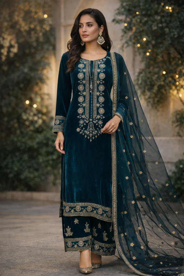 This gorgeous suit comes in micro velvet material with embroidery and tassel detailing on the neck line. The outfit is completed with embroidered plazzo trousers and an embroidered netted duppata.💫🖤