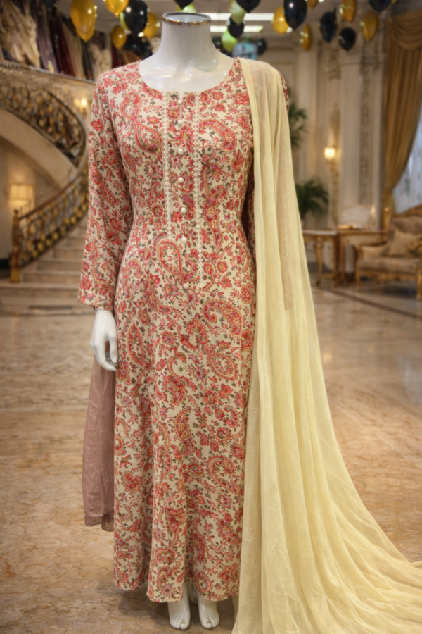 This gorgeous dress comes in linen material with a stunning paisley print. The outfit is completed with a plain white trousers and a chiffon duppata.💫🖤